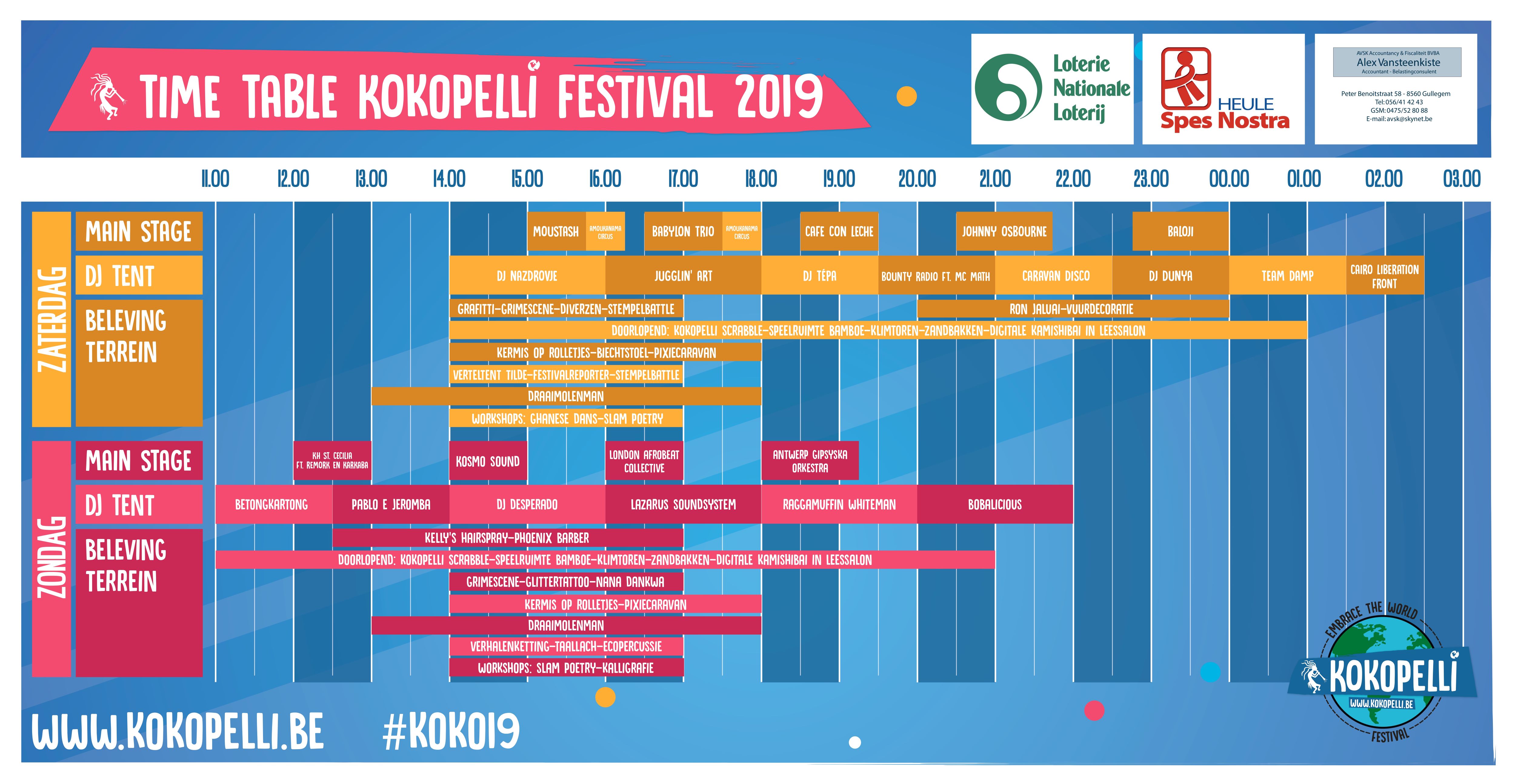 Timetable Kokopelli 201925 apr 20191 minuten om te lezenOntdek ons volledig programma en alle speeluren van de bands, dj's en randanimatie. Klik op deze link om het schema te downloaden.